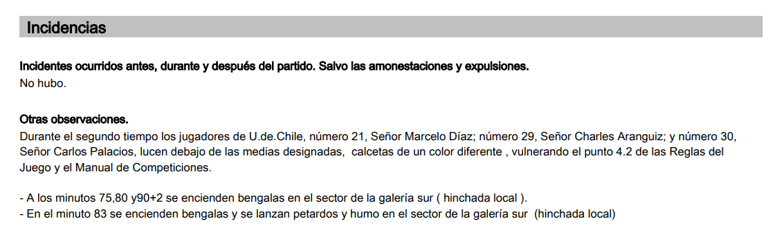 "Durante el segundo tiempo los jugadores de U. de Chile, número 21, Señor Marcelo Díaz; número 29, Señor Charles Aranguiz; y número 30, señor Cristian Palacios lucen debajo de las medias designadas calcetas de un color diferente vulnerando el punto 4.2 de las Reglas del Juego y el Manual de Competiciones", escribió.