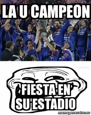 Los mejores "memes" que surgieron tras el nuevo título de Universidad de Chile Publicado: Sabado, 6 de Diciembre de 2014 12 de 14 Los hinchas aplicaron su máxima creatividad para burlarse de sus rivales por obtención de la corona del equipo universitario Los hinchas aplicaron su máxima creatividad para burlarse de sus rivales por obtención de la corona del equipo universitarioFacebook y twitter