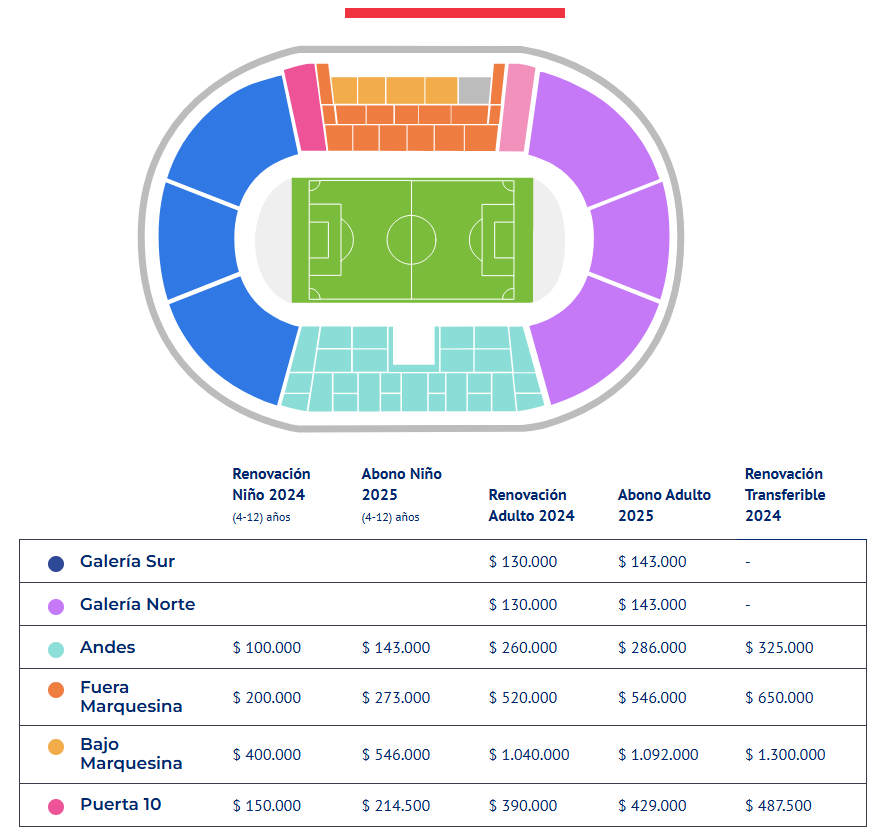 En Andes, en tanto, la renovación Niño cuesta 100.000 pesos, el abono niño está a 143.000 pesos y la renovación de adulto cuesta 260.000 pesos, mientras que el abono en la localidad asciende a 286.000. La renovación transferible, en tanto, tiene un costo de 325.000 pesos.