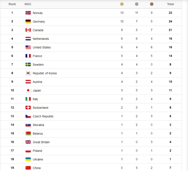 Noruega retiene el primer puesto del medallero con un total de 33 preseas: 13 de oro, 11 de plata y nueve de bronce.