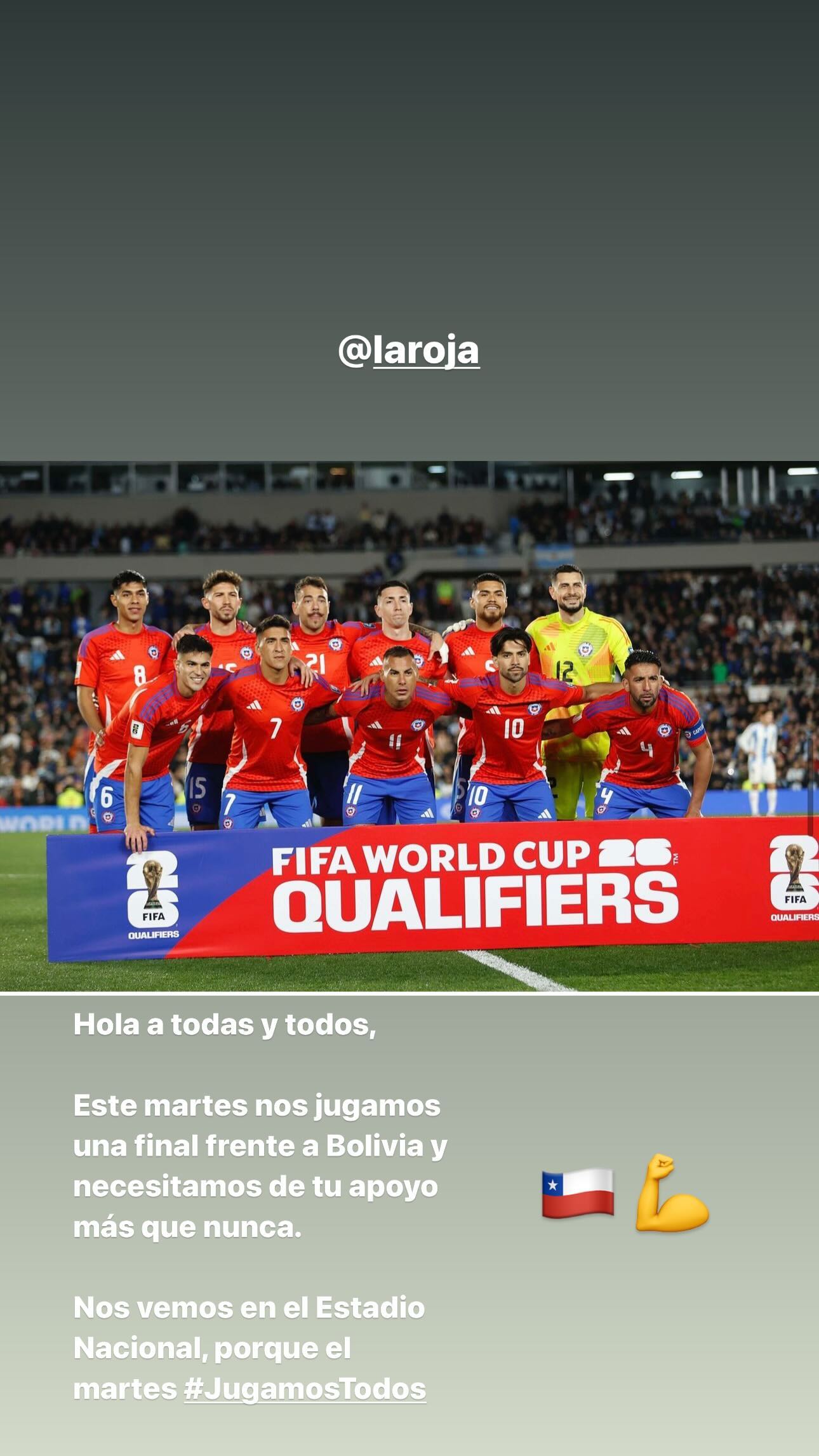 "Este martes nos jugamos una final frente a Bolivia y necesitamos tu apoyo más que nunca", escribió el jugador de Southampton en su cuenta de Instagram.