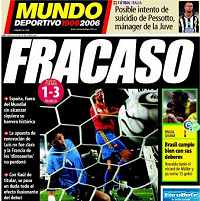 "España, fuera del Mundial sin alcanzar siquiera su barrera histórica (cuartos de final). La apuesta de renovación de Luis (Aragonés) no fue clara y la Francia de los 'dinosaurios' no perdonó. Con Raúl de titular, se puso en duda todo el efecto ilusionante del debut", apuntó el periódico especializado en deportes.