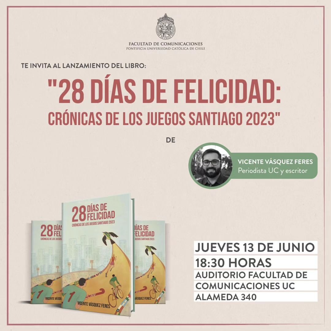 El jueves 13 de junio será el lanzamiento de "28 días de felicidad: Crónicas de los Juegos Santiago 2023", libro escrito por el periodista Vicente Vásquez Feres en el que -trabajando para la Corporación Santiago 2023- narra su experiencia del evento que marcó el deporte nacional el año pasado.
