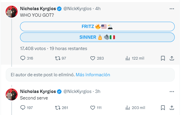 Para ello, a través de X publicó una encuesta en que utilizó controvertidos emojis para referirse a Sinner: Una botella y un par de guantes, en referencia al positivo por clostebol durante Indian Wells, que quedó sin sanción.