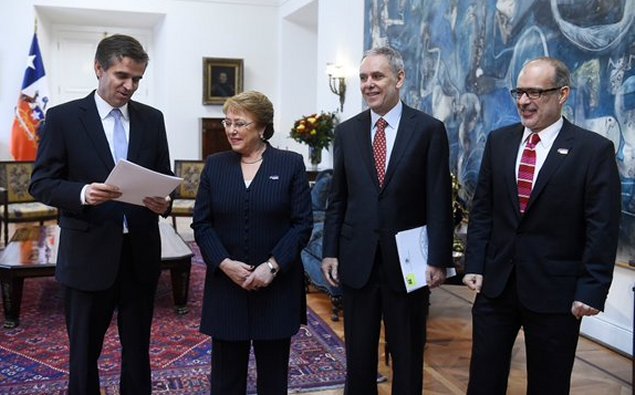 De izquierda a derecha: Rodrigo Vergara, Michelle Bachelet, Alejandro Zurbuchen y Rodrigo Valdés. (Foto: Ministerio de Hacienda)