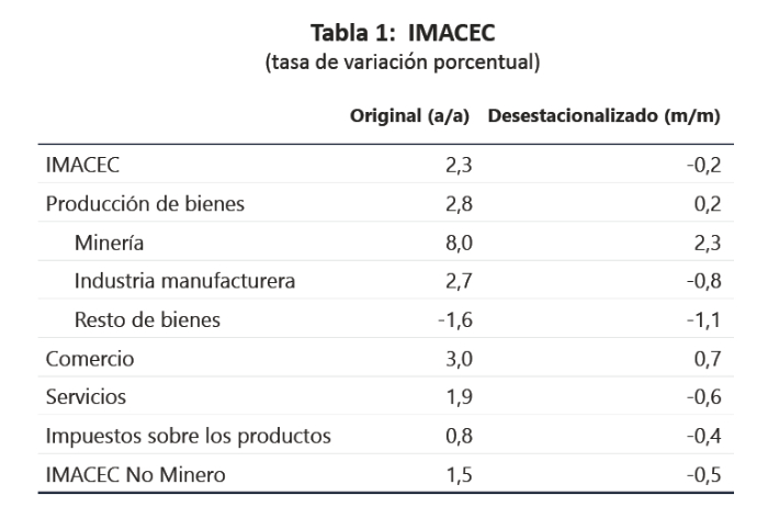 El Imacec no minero presentó un crecimiento anual de 1,5%, mientras que en términos desestacionalizados cayó 0,5% respecto del mes anterior.
