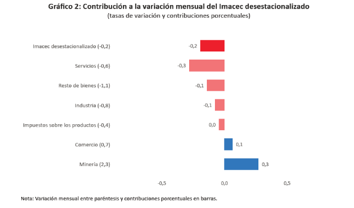 Las cifras ajustadas por estacionalidad dieron cuenta de una disminución de 0,6% respecto del mes precedente, incidida principalmente por los servicios empresariales y de educación, estos últimos afectados por la supensión de clases debido a eventos climáticos.
