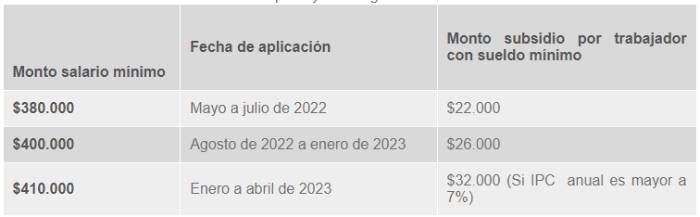Este subsidio temporal mensual a las Mipymes -que será de cargo fiscal- busca no afectar el impacto que puede tener el incremento del salario mínimo, pagando 22.000 pesos en mayo y junio, para luego subir a 26.000 pesos en agosto por cada trabajador/a dependiente contratado/a que perciba el salario mínimo.