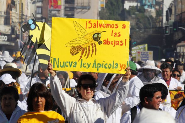 Los apicultores marcharon hacia el Congreso Nacional, en Valparaíso, para alertar sobre la paulatina desaparición de las abejas y exigir, de paso, el proyecto de Ley Apícola y la erradicación de los insecticidas neonicotinoides y agroquímicos nocivos.
