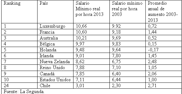 Chile, que figura en el número 24 de 26 países, tiene un sueldo mínimo real por hora de 3,01 dólares, lo que equivale a unos 1.600 pesos y que, de acuerdo a Bloomberg, la sitúa como "la primera nación latinoamericana".