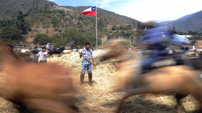 Karen Doggenweiler, Gonzalo Ramirez y la alcaldesa Macarena Santelices, participaron de la tradicional Trilla a yegua suelta, en el sector de la media luna Quebrada Alvarado, del Festival del Huaso de Olmué. El evento culmina este domingo.