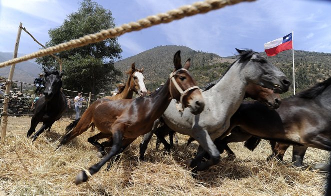 Karen Doggenweiler, Gonzalo Ramirez y la alcaldesa Macarena Santelices, participaron de la tradicional Trilla a yegua suelta, en el sector de la media luna Quebrada Alvarado, del Festival del Huaso de Olmué. El evento culmina este domingo.