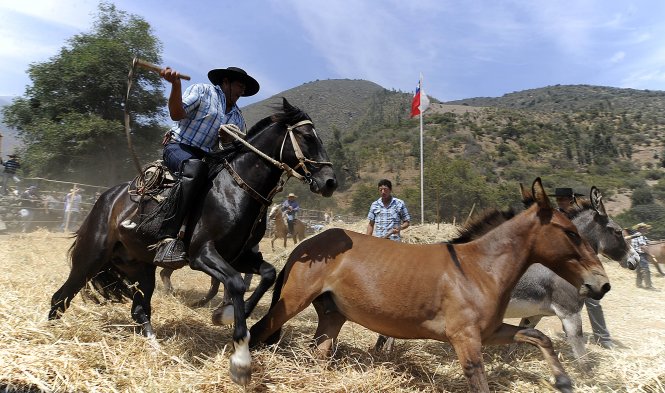 Karen Doggenweiler, Gonzalo Ramirez y la alcaldesa Macarena Santelices, participaron de la tradicional Trilla a yegua suelta, en el sector de la media luna Quebrada Alvarado, del Festival del Huaso de Olmué. El evento culmina este domingo.