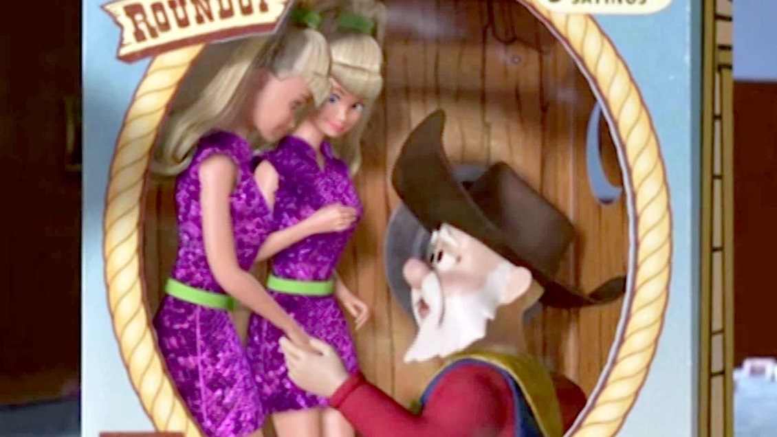 La escena presenta al personaje Stinky Pete, un barbudo personaje, mirando a dos muñecas Barbie y sugiriendo que puede obtener una aparición en una película para ellas mientras acaricia sus manos y sus cuerpos, un tipo de dinámica que ha sido ampliamente condenado en los últimos años.