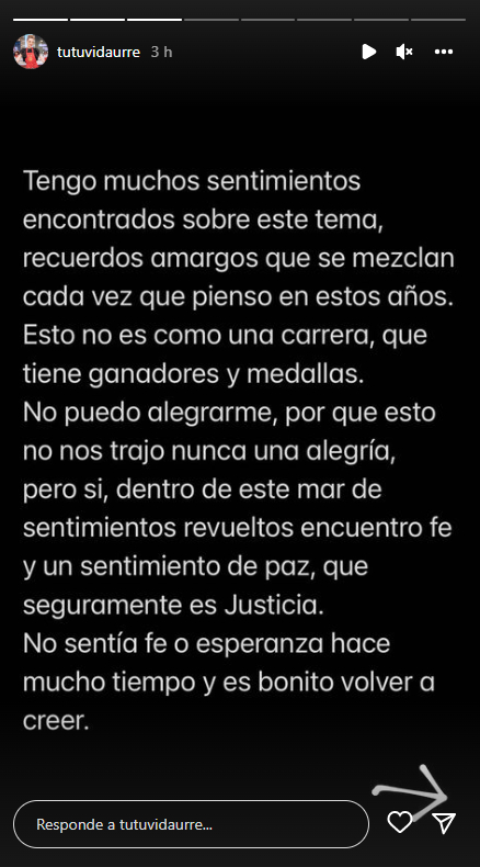 En ese sentido agregó que "no puedo alegrarme, por que esto no nos trajo nunca una alegría", pero que, "dentro de este mar de sentimientos revueltos encuentro fe y un sentimiento de paz, que seguramente es justicia. No sentía fe o esperanza hace mucho tiempo y es bonito volver a creer".