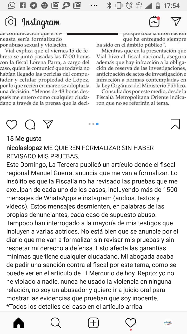 "Lo insólito es que la Fiscalía no ha revisado las pruebas que me exculpan de cada uno de los casos, incluyendo más de 1.500 mensajes de Whatsapp e Instagram (audios, textos y videos). Estos mensajes desmienten, en palabras de las propias denunciantes, cada caso de supuesto abuso", sostuvo López.