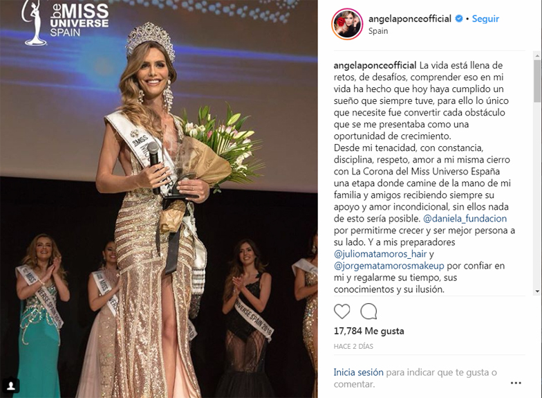 Ponce escribió en su cuenta de Instagram que representar el nombre y los colores de España en el certamen es un "sueño" y que irá rumbo al Miss Universo "con la conciencia y el compromiso de llevar adelante un mensaje de inclusión, respeto, tolerancia, amor por uno mismo, amor por los demás".