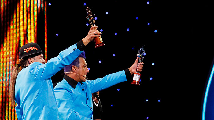 Tópicos: Entretención | Festival de Viña Locos del humor debutó sobre la Quinta Vergara Publicado: Lunes, 24 de Febrero de 2014 3 de 4 El dúo fue el primer número de humor de la 55° versión del festival y se llevó dos antorchas y una Gaviota de plata. El dúo fue el primer número de humor de la 55° versión del festival y se llevó dos antorchas y una Gaviota de plata. Agencia Uno