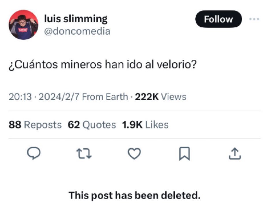 El pasado miércoles "Don Comedia" escribió en X, red social donde era muy activo, la siguiente frase: "¿Cuántos mineros han ido al velorio?".