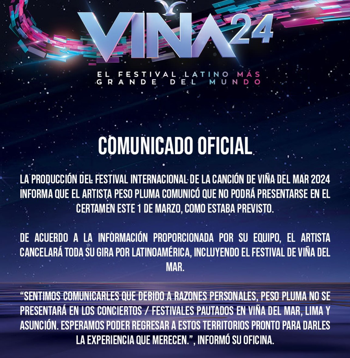 Luego de que Peso Pluma cancelara su presentación en el Festival de Viña del Mar, la organización explicó las razones detrás de la baja del artista.