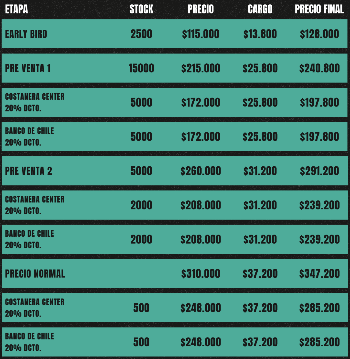 Una vez agotados se iniciará la preventa 1, la cual contará con un par de descuentos especiales de un 20%. Para el público general esta entrada, válida para las 3 jornadas de festival, tendrá un precio de $240.800.