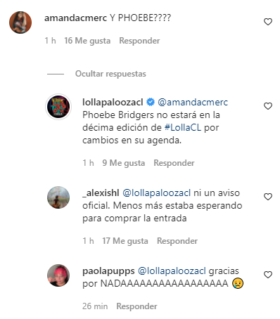 Los seguidores de la estadounidenselo notaron e hicieron notar su reclamo en las redes sociales del evento, donde la productora a cargo aseguró que "Phoebe Bridgers no estará en la décima edición de #LollaCL por cambios en su agenda".