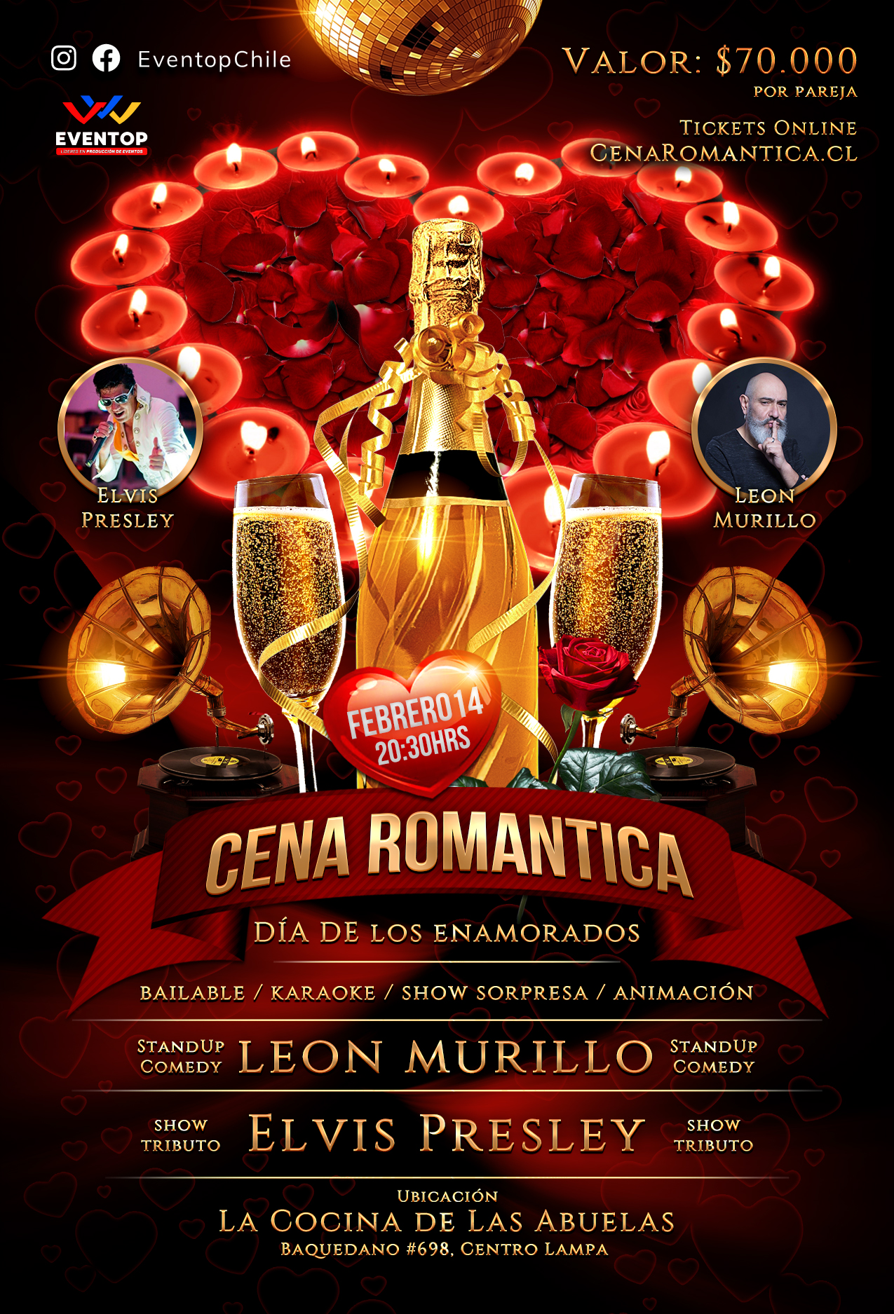 Las entradas para esta íntima velada tienen un valor de $70.000 por pareja y se podrán adquirir desde este viernes 31 de enero en cenaromantica.cl.
