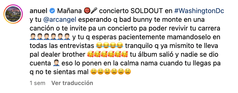Anuel AA, por su parte, le respondió a Arcángel el 9 de diciembre con un mensaje en Instagram indicándole que al día siguiente tendría un concierto vendido completamente en Washington, D.C., y que estaba esperando a que Bad Bunny "te monte" (incluya) "en una canción o te invite pa un concierto pa poder revivir tu carrera".