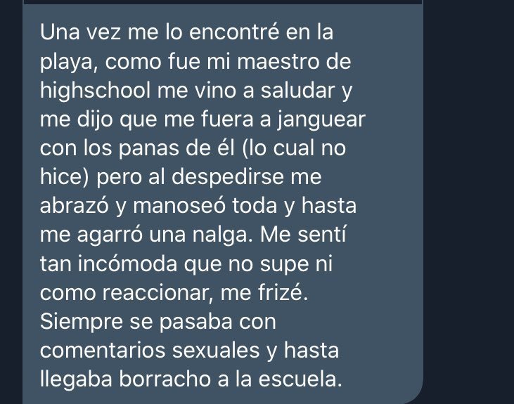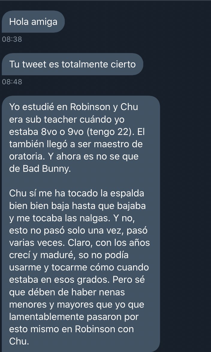 Las acusaciones contra El Chucheto son graves. Incluso, uno de los casos asegurá que el sujeto tocaba a sus alumnas cuando hizo clases en en la escuela secundaria Robinson School en Puerto Rico. "La primera vez que tuvimos sexo, yo no quería. Era mi primera vez. Yo le dejé saber que no quería, pero no le importó, estaba borracho y arrebatado", cuenta otro de los mensajes.