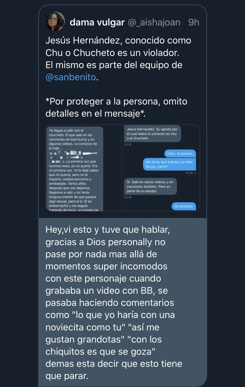 Con estos testimonios a la luz los dardos apuntaron a Bad Bunny por su relación laboral y de amistad que guardaba con El Chucheto. Pese a ello el intérprete de "Vete" expresó su apoyo a las víctimas a quienes instó a que "sigan exponiendo a todos sin miedo, nunca se queden calladas".