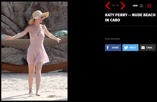 El portal de farándula TMZ publicó una galería de imágenes de la cantante Katy Perry, donde aparecía con un sexy traje de baño color piel. Según reportaron, tuvieron que mirar las fotos dos veces para darse cuenta de que la artista no estaba desnuda.