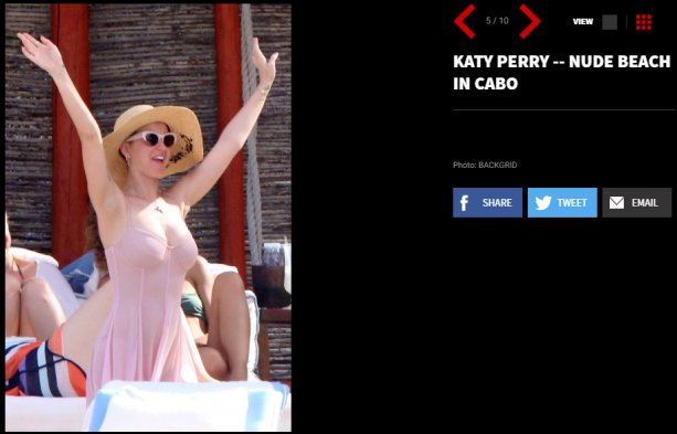 El portal de farándula TMZ publicó una galería de imágenes de la cantante Katy Perry, donde aparecía con un sexy traje de baño color piel. Según reportaron, tuvieron que mirar las fotos dos veces para darse cuenta de que la artista no estaba desnuda.