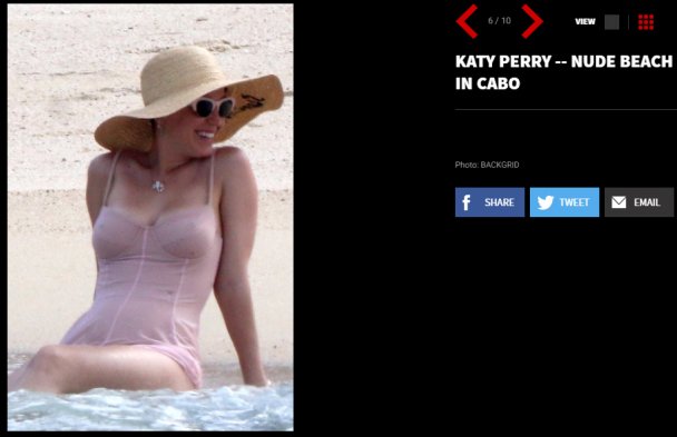 El portal de farándula TMZ publicó una galería de imágenes de la cantante Katy Perry, donde aparecía con un sexy traje de baño color piel. Según reportaron, tuvieron que mirar las fotos dos veces para darse cuenta de que la artista no estaba desnuda.