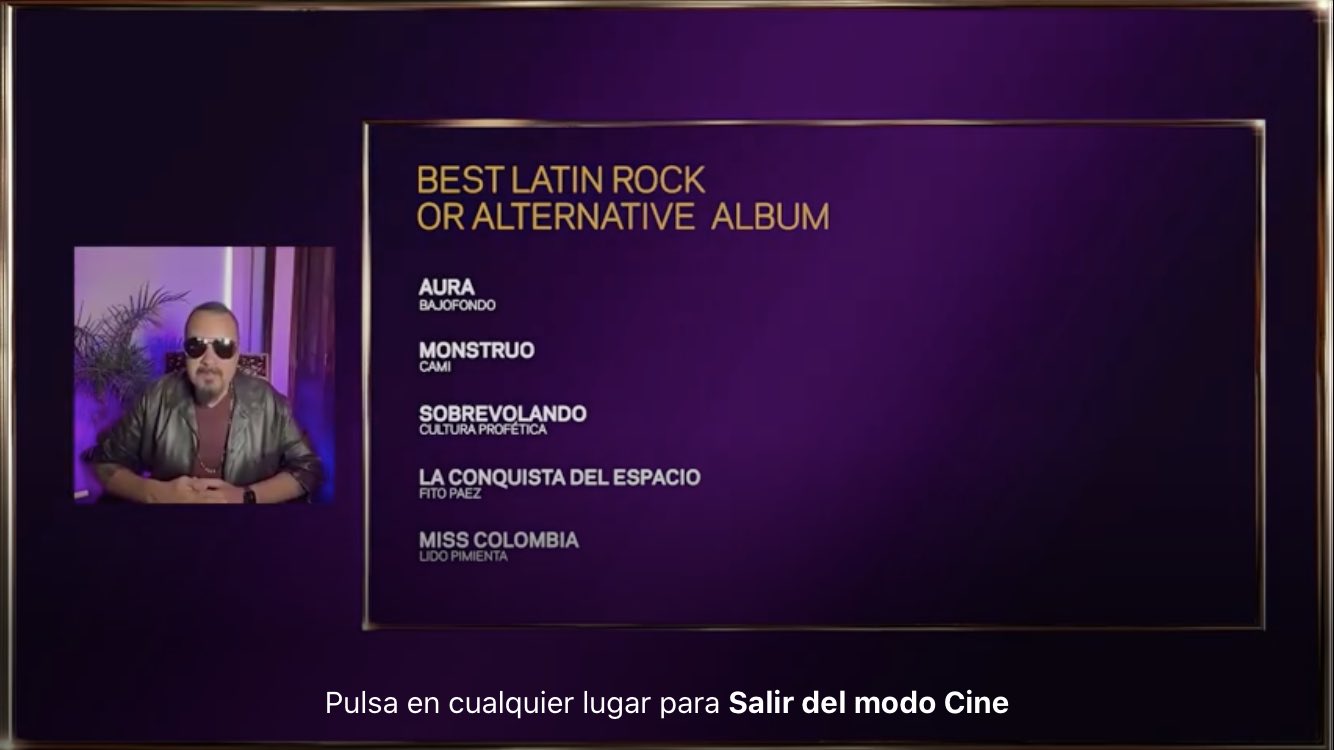 En la categoría competirá ante "La conquista del espacio" de Fito Páez; "Sobrevolando" de Cultura Profética; "Aura" de Bajofondo y "Miss Colombia" de Lido Pimienta.
