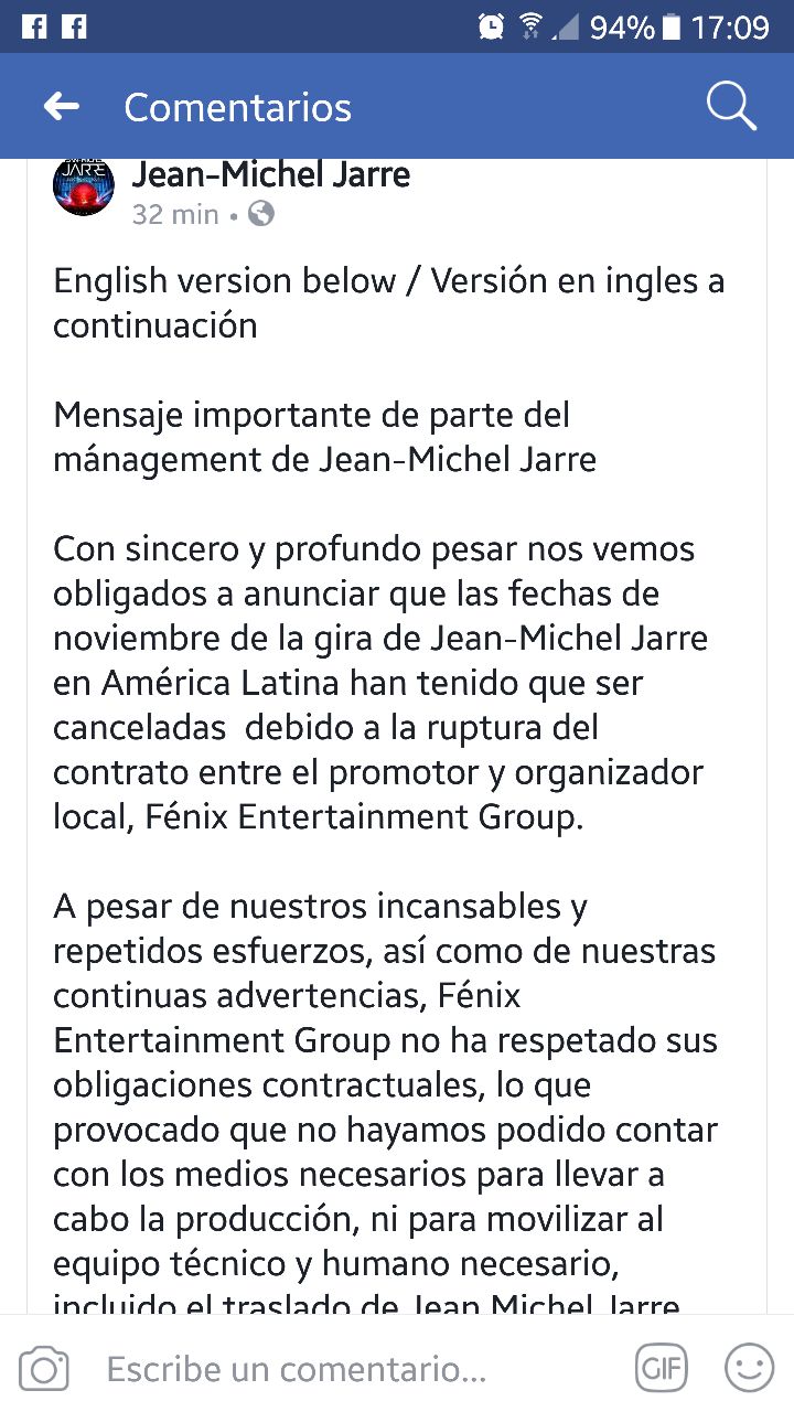 La noticia se dio a conocer a través de un comunicado publicado en el fanpage oficial del artista en Facebook. "Nuestra primera obligación, como mánagers y responsables de la producción de la gira de Jean-Michel Jarre, es proteger a nuestro leal equipo, a nuestros fieles proveedores técnicos y a nuestro artista, de impagos por parte del promotor local", detallaba el documento que apuntaba a la productora Fénix Entertainment Group.