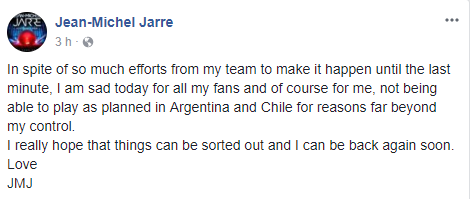Este pasado viernes el músico francés Jean-Michael Jarre anunciaba que su gira por Latinoamérica, que lo tendría en Chile el próximo 14 de noviembre se había cancelado. No obstante, horas después, ese mensaje fue borrado generando confusión.