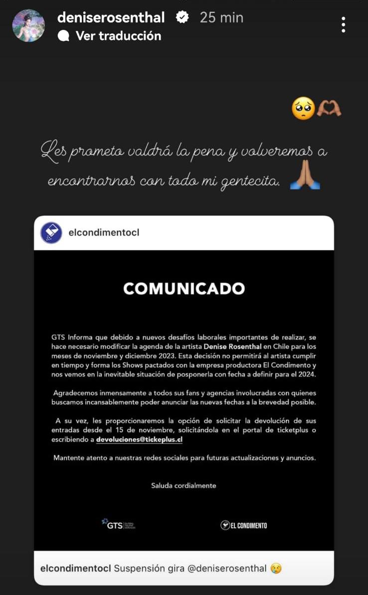 Sin embargo este lunes la productora a cargo comunicó la cancelación de la gira de Denise Rosenthal argumentando "a nuevos desafíos laborales importantes de realizar, se hace necesario modificar la agenda de la artista".