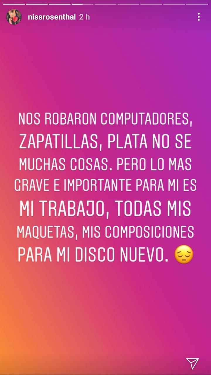 "Nos robaron computadores, zapatillas, plata, no sé, muchas cosas. Pero lo más grave e importante para mí es mi trabajo, todas mis maquetas, mis composiciones para mi nuevo disco", aseguró en su cuenta de Instagram.