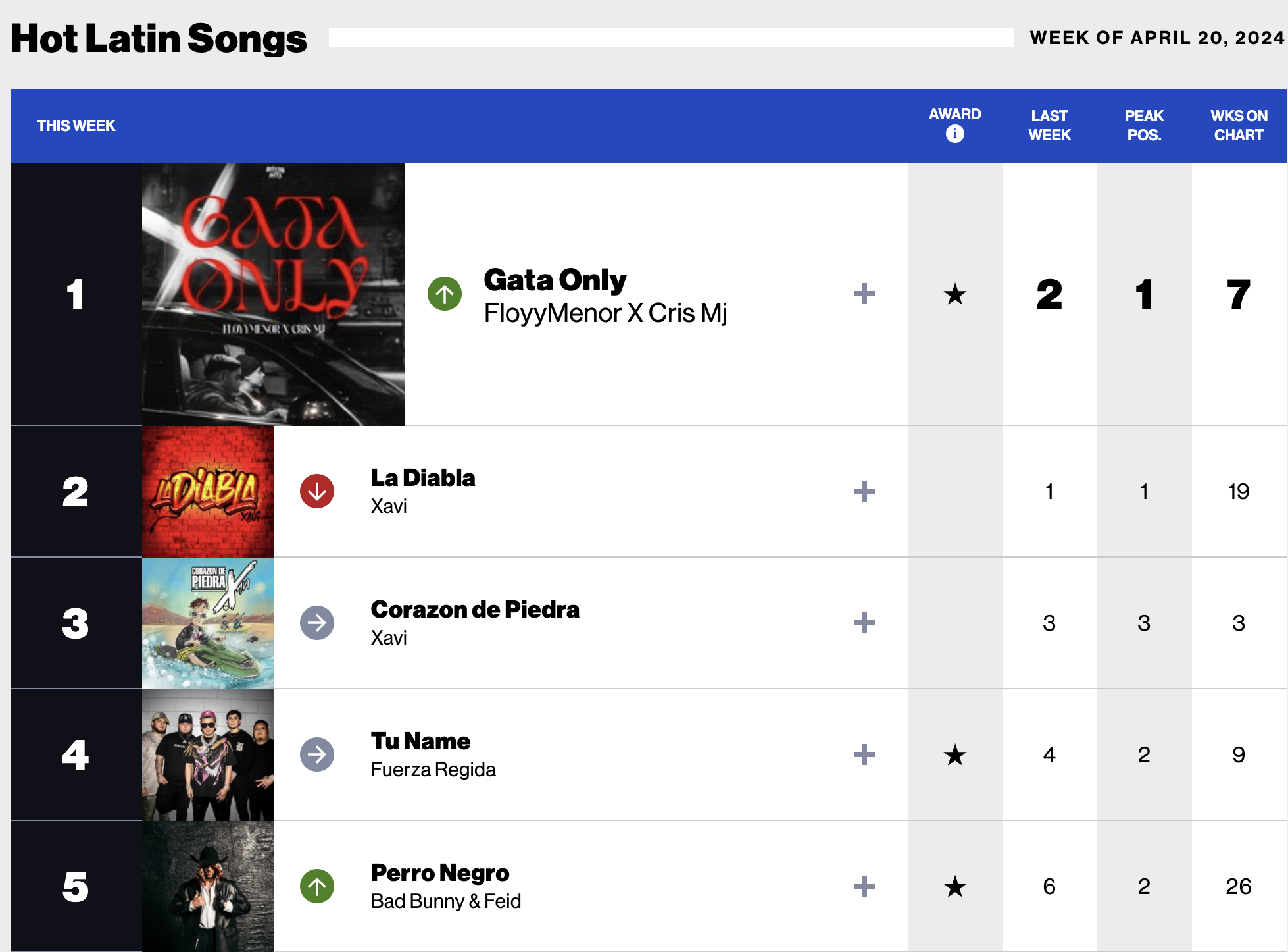 La semana pasada "Gata Only" se posicionó en el segundo lugar de esta lista debajo de "La Diabla" del mexicano Xavi. Sin embargo en unos días la canción de FloyyMenor logró superarla y ponerse en el primer lugar.