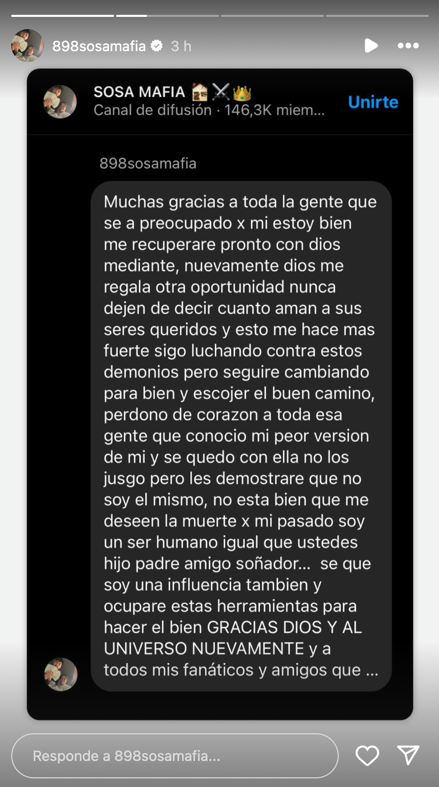 Este jueves el artista usó sus redes sociales para referirse al tema y aseguró que "Dios me regala otra oportunidad". "Esto me hace más fuerte, sigo luchando contra esos demonios pero seguiré cambiando para bien, y escogiendo el buen camino, perdono de todo corazón a toda esa gente que conoció mi peor versión y se quedó con ella", escribió en Instagram.