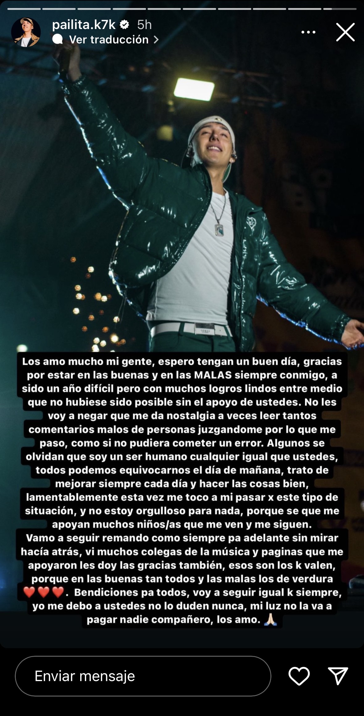 "Algunos se olvidan que soy un ser humano cualquier igual que ustedes, todos podemos equivocarnos el día de mañana, trato de mejorar siempre cada día y hacer las cosas bien, lamentablemente esta vez me toco a mi pasar x este tipo de situación, y no estoy orgulloso para nada, porque se que me apoyan muchos niños/as que me ven y me siguen", afirmó el exponente del género urbano.