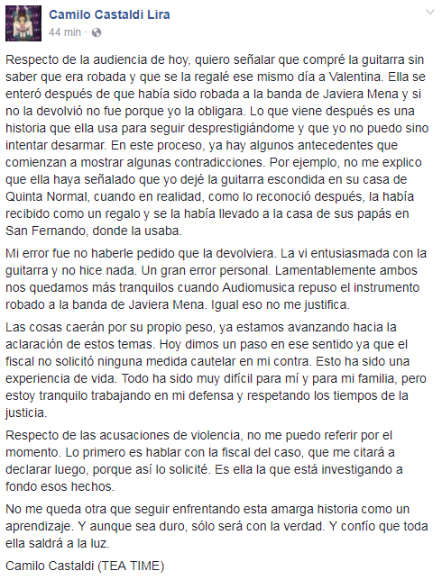 Horas más tarde el ex cantante de Los Tetas publicó en su perfil de Facebook su versión de lo sucedido y arremtió contra su ex pareja Valentina Henríquez, quien lo denunció por la receptación del instrumento y por violencia doméstica.