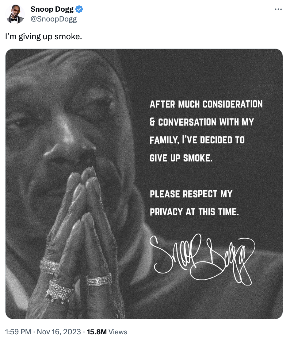 El rapero Snoop Dogg sorprendió a sus fanáticos al anunciar que abandonará una de las prácticas que más le ha traído notoriedad en el mundo.