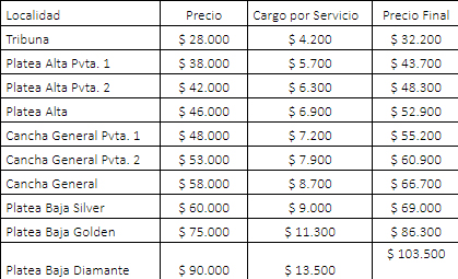 Los valores irán desde los $32.200 para la localidad de tribuna hasta los $103.500 de Platea Baja Diamante.