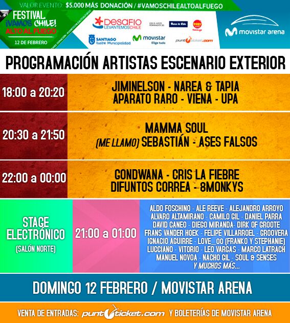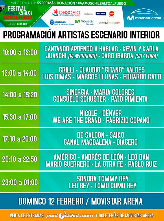 Ya está todo listo para el festival solidario "Vamos Chile - Alto al Fuego", el cual se realizará este domingo 12 de febrero en el Movistar Arena para ir en ayuda de los damnificados que dejaron los incendios forestales en la zona centro sur del país.