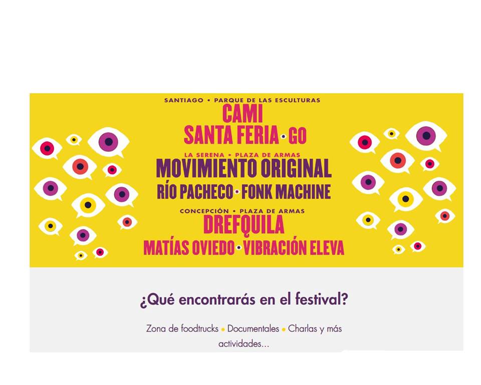 Con un mensaje que apunta a erradicar el ciberacoso, el evento contará con tres escenarios y un puñado de artistas. En Santiago, el espectáculo lo protagonizarán GO, Cami Gallardo y Santaferia en el Parque de las Esculturas de Providencia.