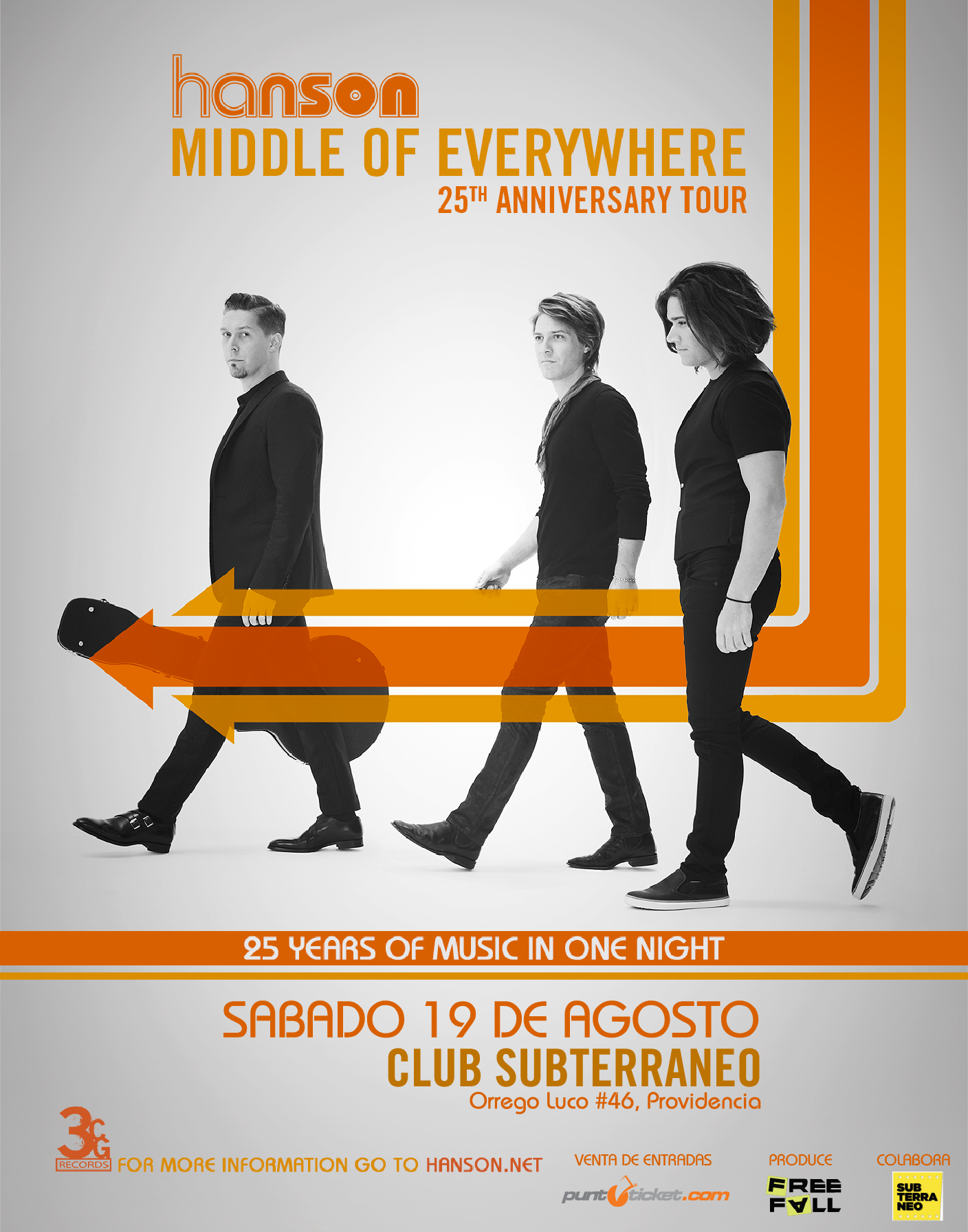 El trío de hermanos Hanson regresará a Chile el próximo 19 de agosto. Su presentación, que conmemorará los 25 años de carrera artística que ostentan, tendrá lugar en Club Subterráneo y contará con entradas limitadas por la capacidad del recinto.