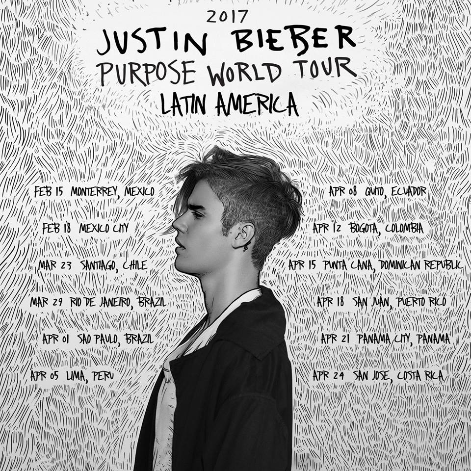 El intérprete de "Sorry" anunció que iniciará el periplo latinoamericano de su gira "Purpose World Tour", el cual se extenderá entre el 15 de febrero y el 24 de abril y pasará por México, Brasil, Costa Rica, Colombia, Ecuador, Perú, República Dominicana, Puerto Rico y Chile.
