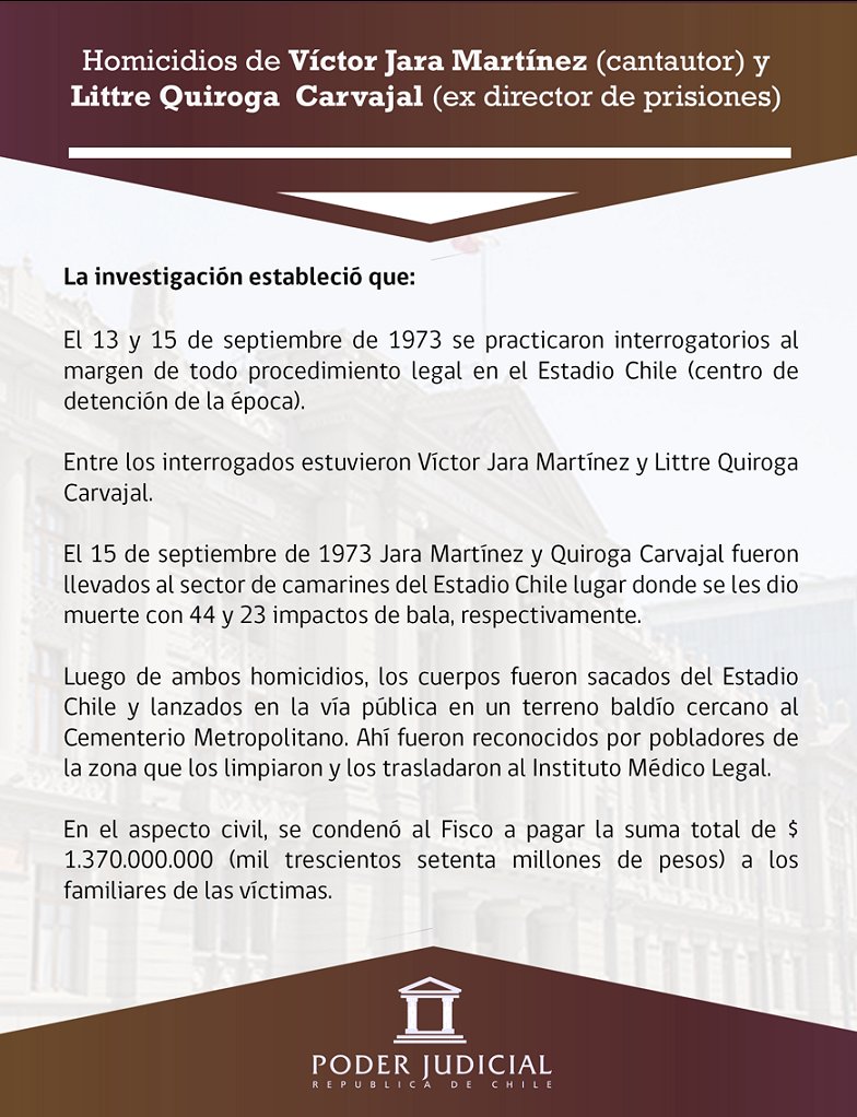 El ministro en visita de la Corte de Apelaciones de Santiago para causas de violaciones de los derechos humanos Miguel Vázquez condenó a nueve miembros del Ejército en retiro por su responsabilidad en los homicidios del cantautor Víctor Jara Martínez y el ex director de prisiones Littré Quiroga Carvajal, ocurridos en septiembre de 1973 en Santiago.
