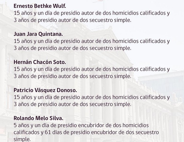 El magistrado sentenció a Hugo Sánchez Marmonti, Raúl Jofré González, Edwin Dimter Bianchi, Nelson Haase Mazzei, Ernesto Bethke Wulf, Juan Jara Quintana, Hernán Chacón Soto y Patricio Vásquez Donoso a 15 años y un día por su responsabilidad como autores de ambos homicidios.
